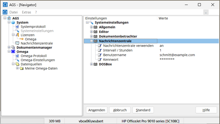 Please remember to enter your username and password in the details view of AGS | System | System settings in the AGS Navigator under the heading "Message Center" after installation.