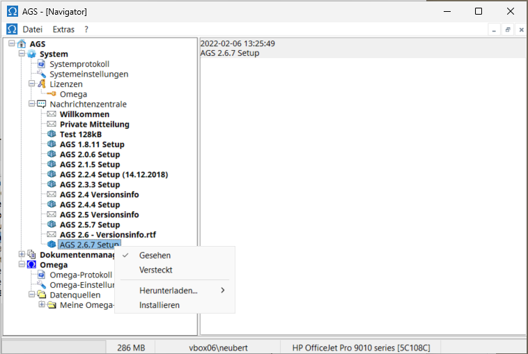 Then, in the AGS Navigator, expand AGS | System | Message Center and right-click on the setup file for the version you wish to install. Select Install from the context menu and follow the program's instructions. If no entries are displayed in the message center after entering your username and password in the message center settings, right-click on the message center entry in the AGS navigator and select Check for messages .