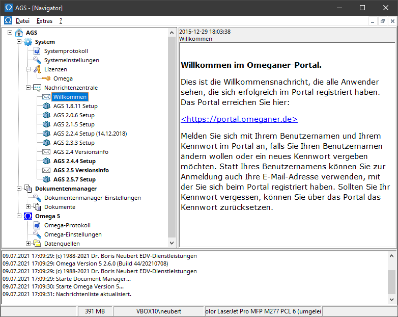 Text messages are represented by an envelope icon, installation files by a package icon. Unread messages are highlighted in bold. Clicking on a text message displays it in detail. Installation files can be downloaded or installed via the context menu . Downloaded files are located in the folder [Personal Settings]\bnuv\Framework\downloads\ .