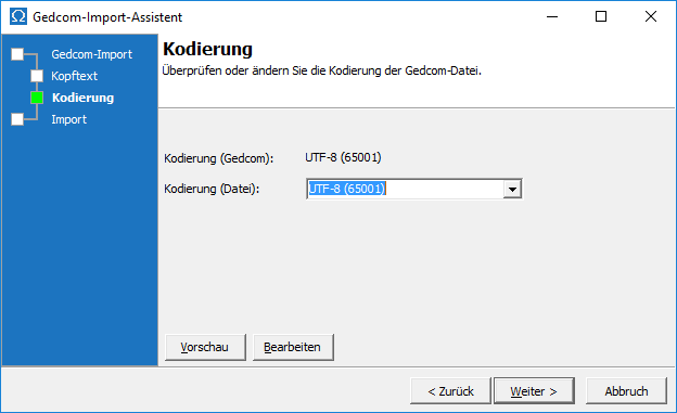 Under Encoding (Gedcom) , you can see the encoding specified by the creator of the Gedcom file, and under Encoding (File) , you can see the encoding in which the file is currently loaded. Set the file's encoding to the value specified under Encoding (Gedcom) . If you are unsure, you can open the file in the document viewer by clicking Preview and check, for example, whether the umlauts are displayed correctly or whether you see garbled text due to incorrect encoding.