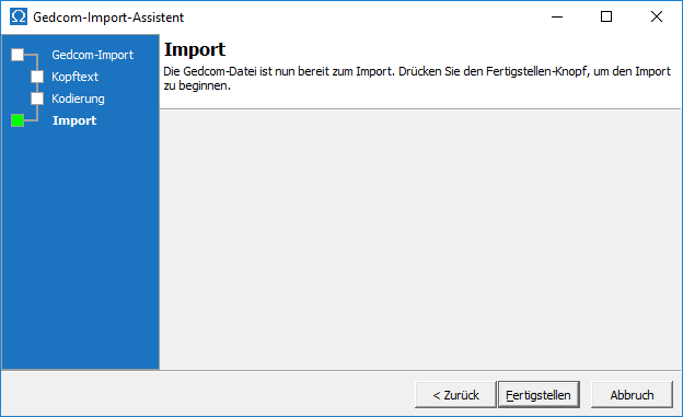 Right-click on any person directory and select Import | Gedcom from the context menu. In the current program version, it doesn't matter which person directory you select – after the import, the imported people will only be located in the "All People" directory and in a new user-created person directory . The Gedcom import wizard opens: