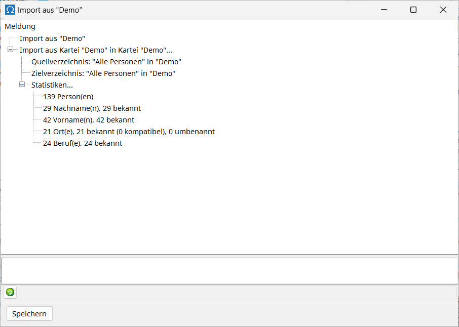 During the import process, in addition to the imported persons, their last names, first names, places and professions are newly created in the target file, provided these are not already recorded there. Furthermore, links to parents, spouses, and children are copied only if these individuals are copied in the same import process. Therefore, it makes a difference whether you copy a person and their father separately or together. If you copy the individuals individually, the father-child link will not be created in the target record. When copying them together, the father-child link is retained.