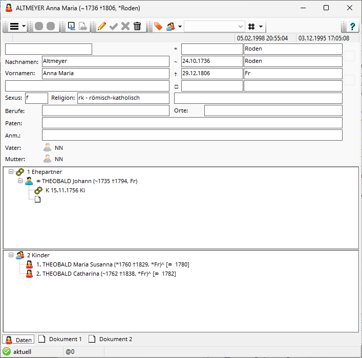 The upper field shows the individual data on Anna Maria ALTMEYER , the middle field lists the connection to her husband Johann THEOBALD , and the lower field shows the links to her two children Maria Susanna and Catharina .