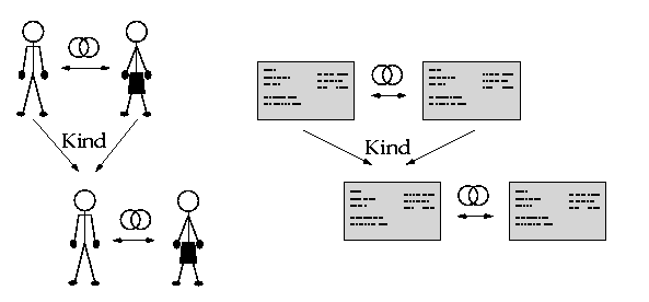 A person is embedded in their family environment by listing their parents, spouse, and children. The following diagram illustrates the difference between the real people with their marital and child relationships on the one hand, and the index cards and links that represent these people and their relationships on the other: