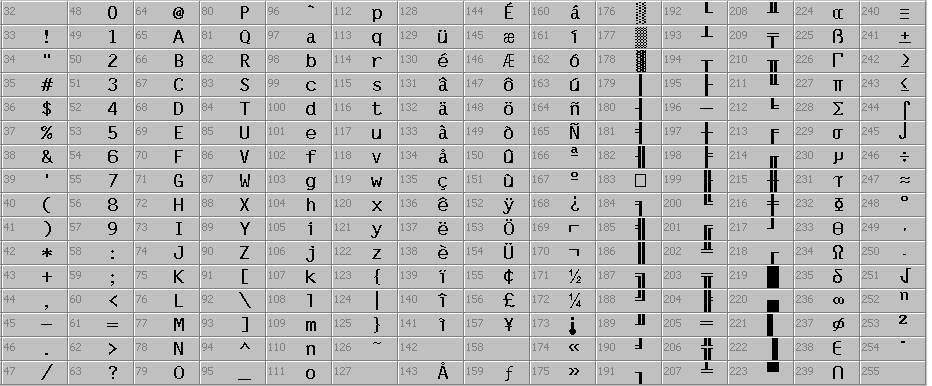 Characters that you cannot find on the keyboard can be generated as follows: find the ASCII code of the desired character in the table above (e.g., 236 for the ∞ symbol), then hold down the left Alt key and type the number sequence 2 3 6 on the numeric keypad on the right side of your keyboard. After releasing the Alt key, the desired character will appear.
