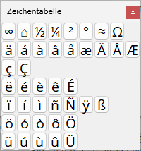 The character map allows you to insert frequently used special characters into a text input field or document by clicking on a character with the left mouse button.