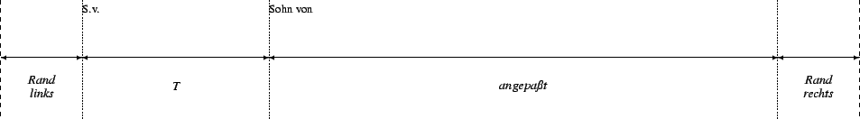 In the reports, you can adjust the available width for individual text elements within a line by specifying dimensions according to your preferences. The dimensions used are labeled A , B , E , F , G , I , K , L1 , L2 , L3 , M , N , O , P , and T These dimensions (in millimeters) are defined in the system settings for displaying Omega-5 reports . For each section of an evaluation, format templates are defined that contain the measurements. These format templates are included in the RTF files created by Omega, allowing you to modify the measurements later in your word processing program.