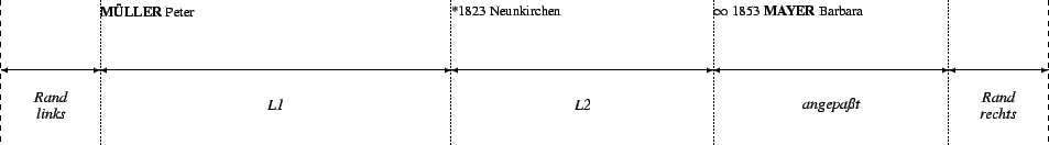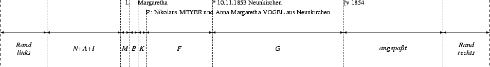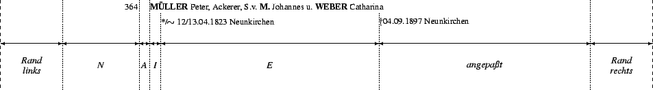 The measurements given below are valid for the following evaluation formats: family record, personal record, local family register, lineage, ancestor lineage, (extended) lineage list, and (extended) ancestor list. For evaluation formats or settings where no consecutive number precedes the family block, lengths N and A are assumed to be zero millimeters. Parents' Block