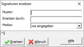 Example: You use the letter A followed by a number as your signature, e.g., A4711 or A620 . To replace the letter A with Kb in all signatures of this type while keeping the number, enter ^A(\d+)$ as the pattern and replace it with Kb$1 . ^ represents the beginning and $ the end of the signature, so that only signatures that completely match the pattern A(\d+) are found. \d+ represents one or more digits. The parentheses define a group of characters that is referenced again by $1 during the replacement. For the signature A4711 , 4711 is referenced again and appended to Kb , resulting in Kb4711 .