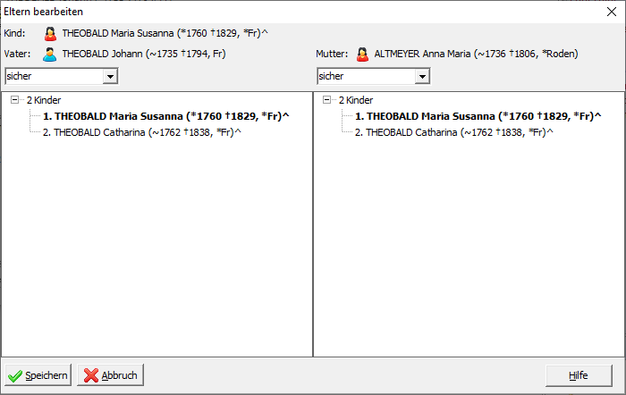 Under the father and mother, all children of those parents are listed. The child whose parents you are editing is highlighted in bold in the respective list. You can also change the order of the children for both the father and mother by dragging and dropping them with the left mouse button.