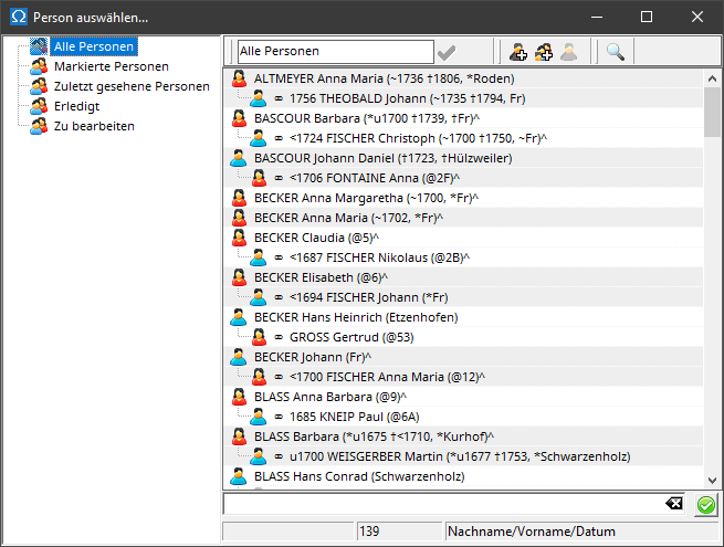 These are used to create and select a new person or a new person along with their parents. The gray icon removes a link or creates a link to an unknown person ( NN ).