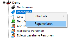 Before opening the directories for last names, first names, places, professions, and the directory of all persons, the program checks whether the number of entries in the directory exactly matches the number of respective objects in the database. If this is not the case, the program offers to regenerate the directory. You can also regenerate one of the aforementioned directories yourself at any time by selecting the "Regenerate" menu item from the directory's context menu.