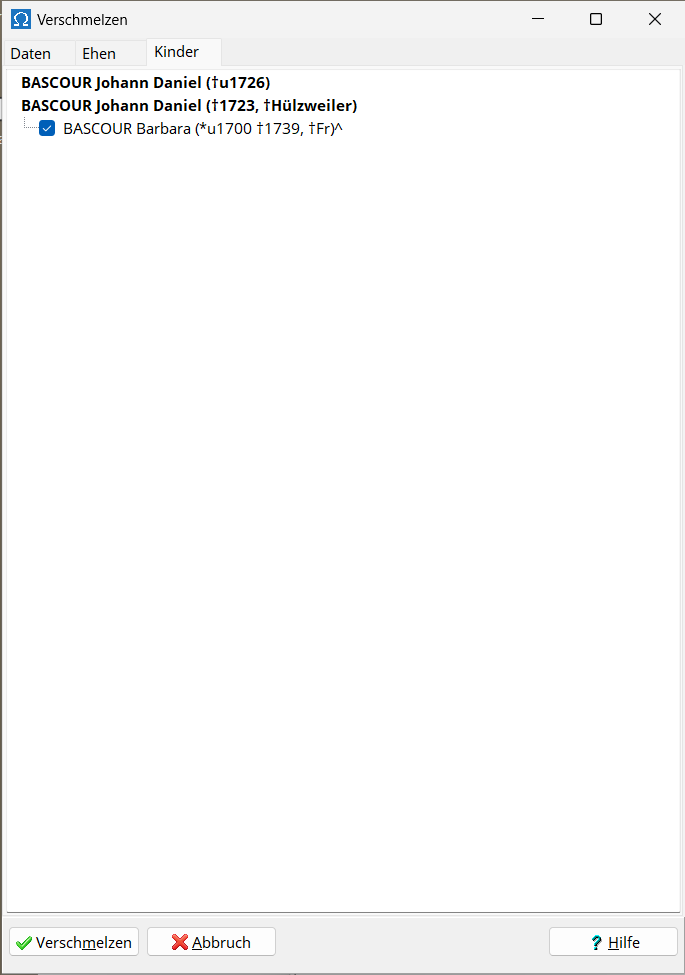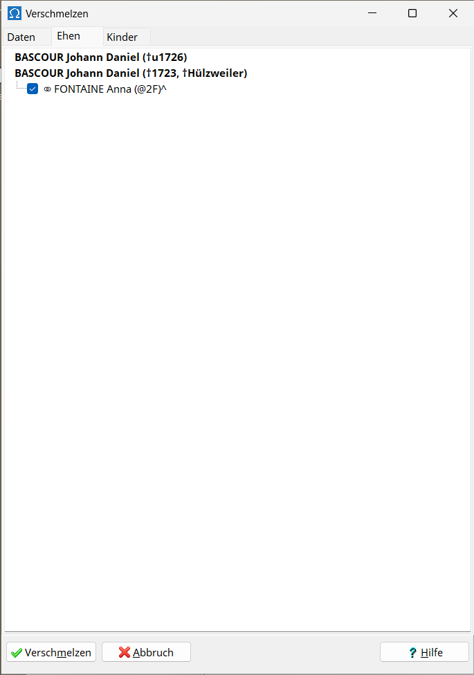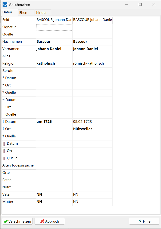 Life data, documents, marriages, and links to parents and children are merged when Person B is merged into Person A, and then Person B is deleted. Since the duplicates may contain conflicting data, you must decide which data fields from Person A and which from Person B should be transferred. An interface will open for selecting the data to be transferred.