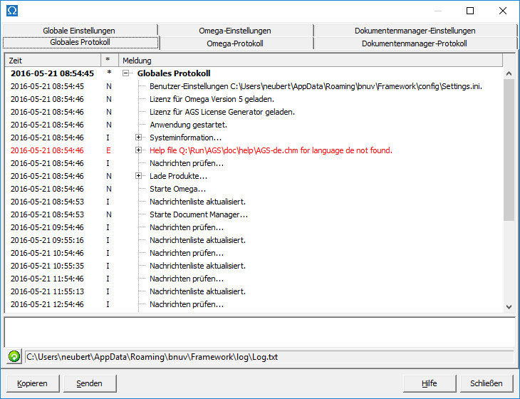 Le rapport système contient les journaux de l'exécution du programme ainsi que des informations détaillées sur la configuration d'AGS, Omega et Document Manager et de toutes les sorties actuelles d'Omega dans la DOSBox. Le rapport système permet au support d'analyser les erreurs en cas de problème.